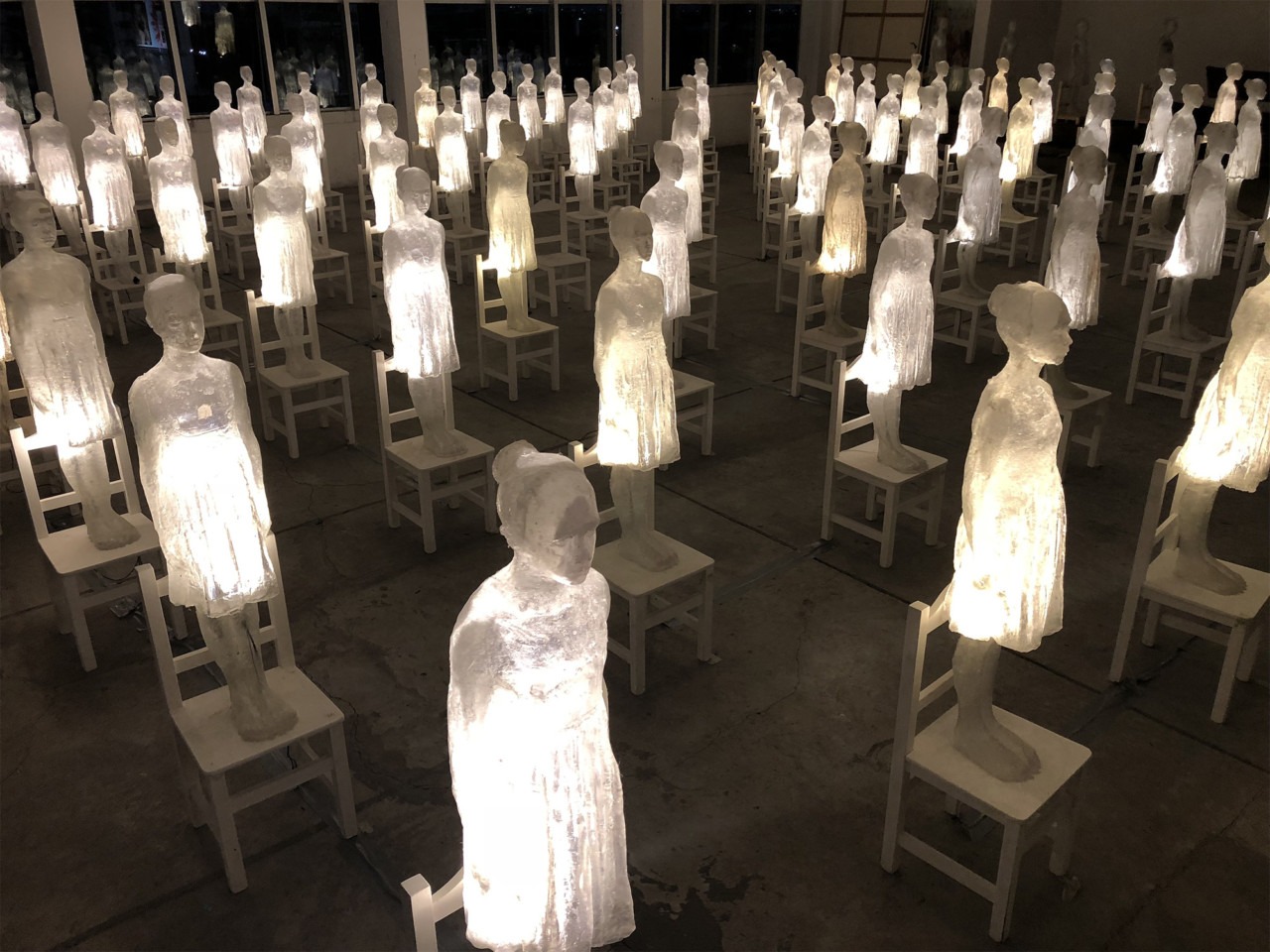 One-hundred and five fiberglass figures to be precise, aligned on white chairs in rows that extend from the floor to the ten-meter high ceiling.